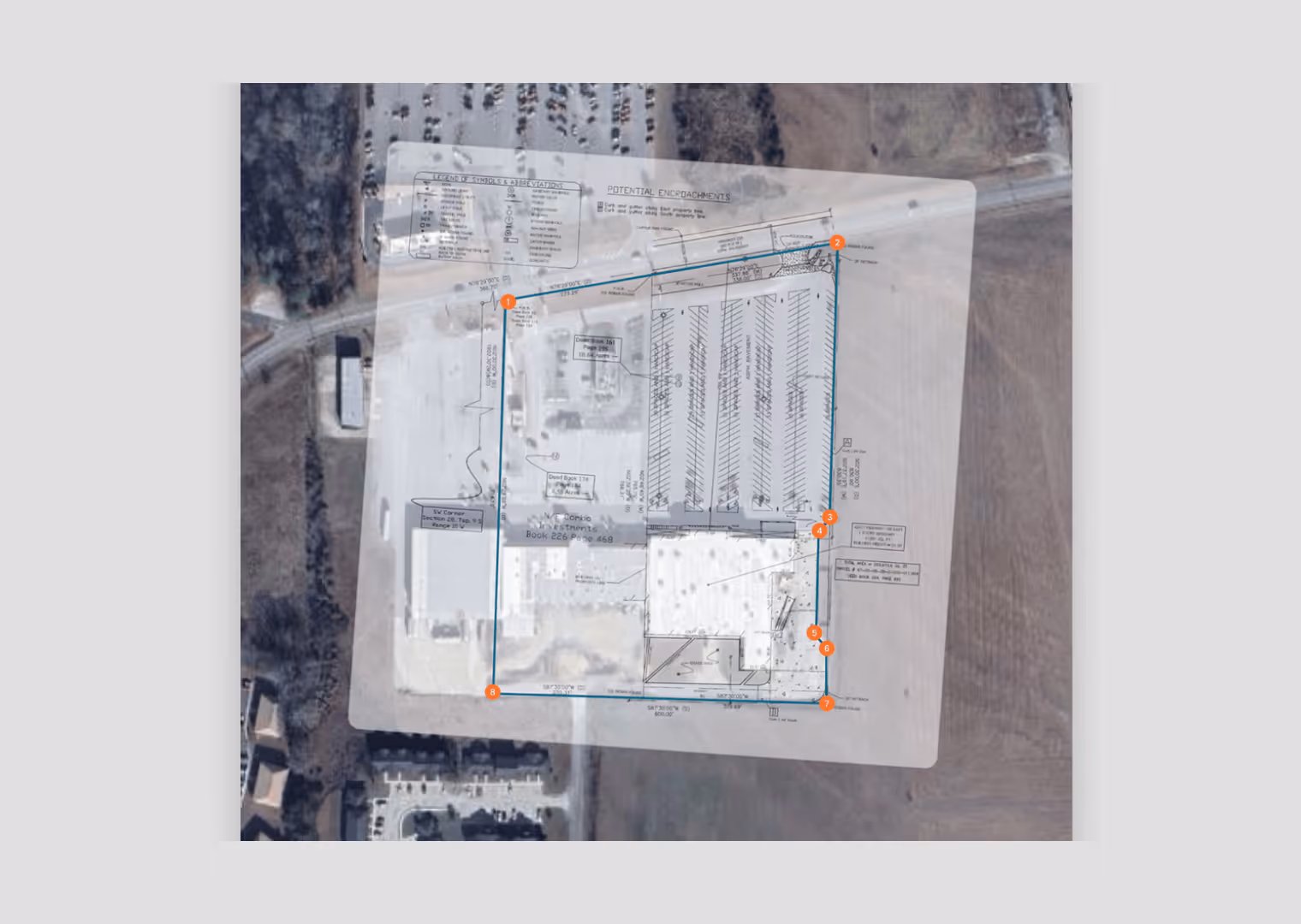 ✓ Overlay surveys and plat maps: Identify risk earlier by layering documents on top of parcel data and map layers to validate boundaries, see the surrounding area, and spot issues like encroachments.