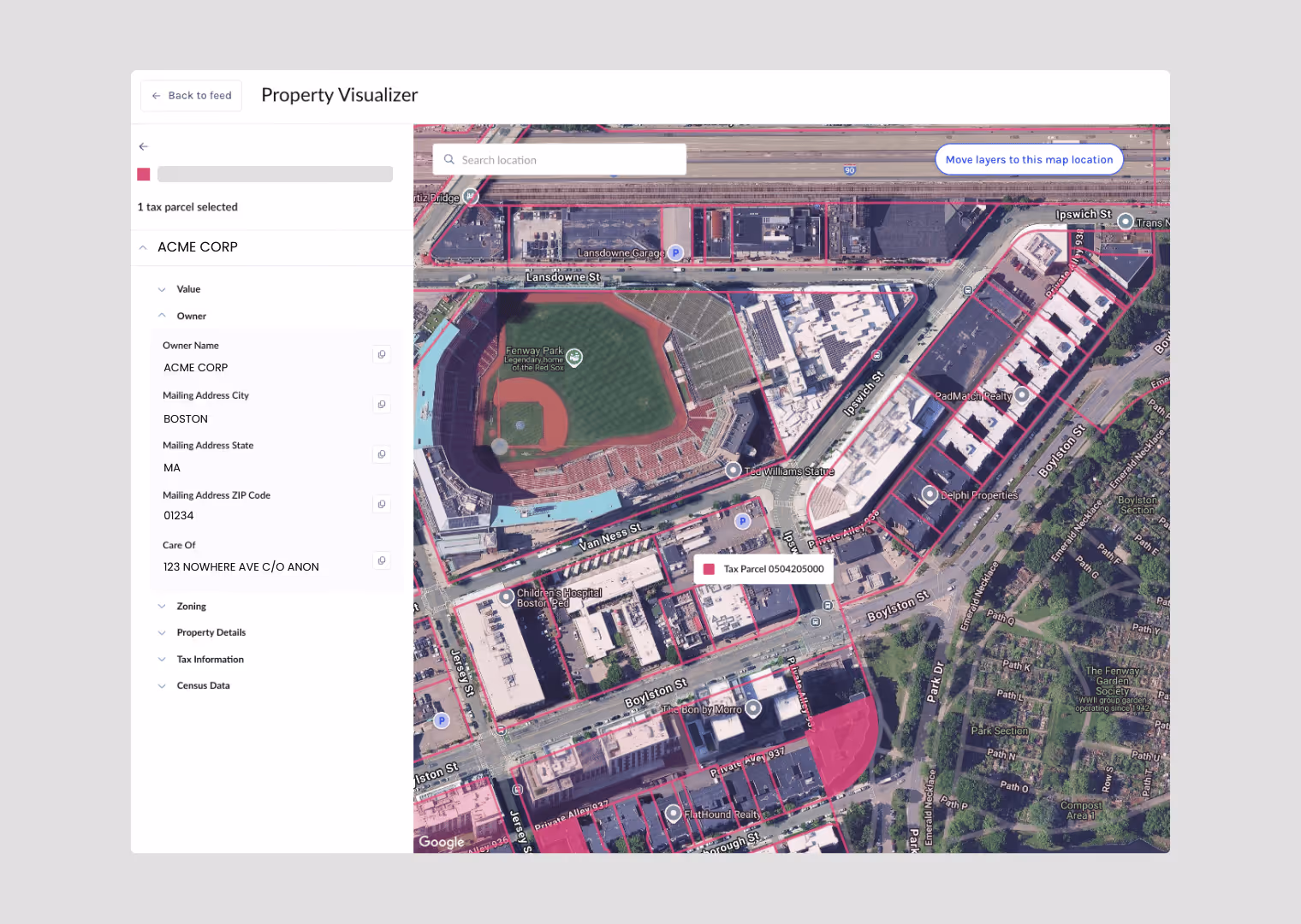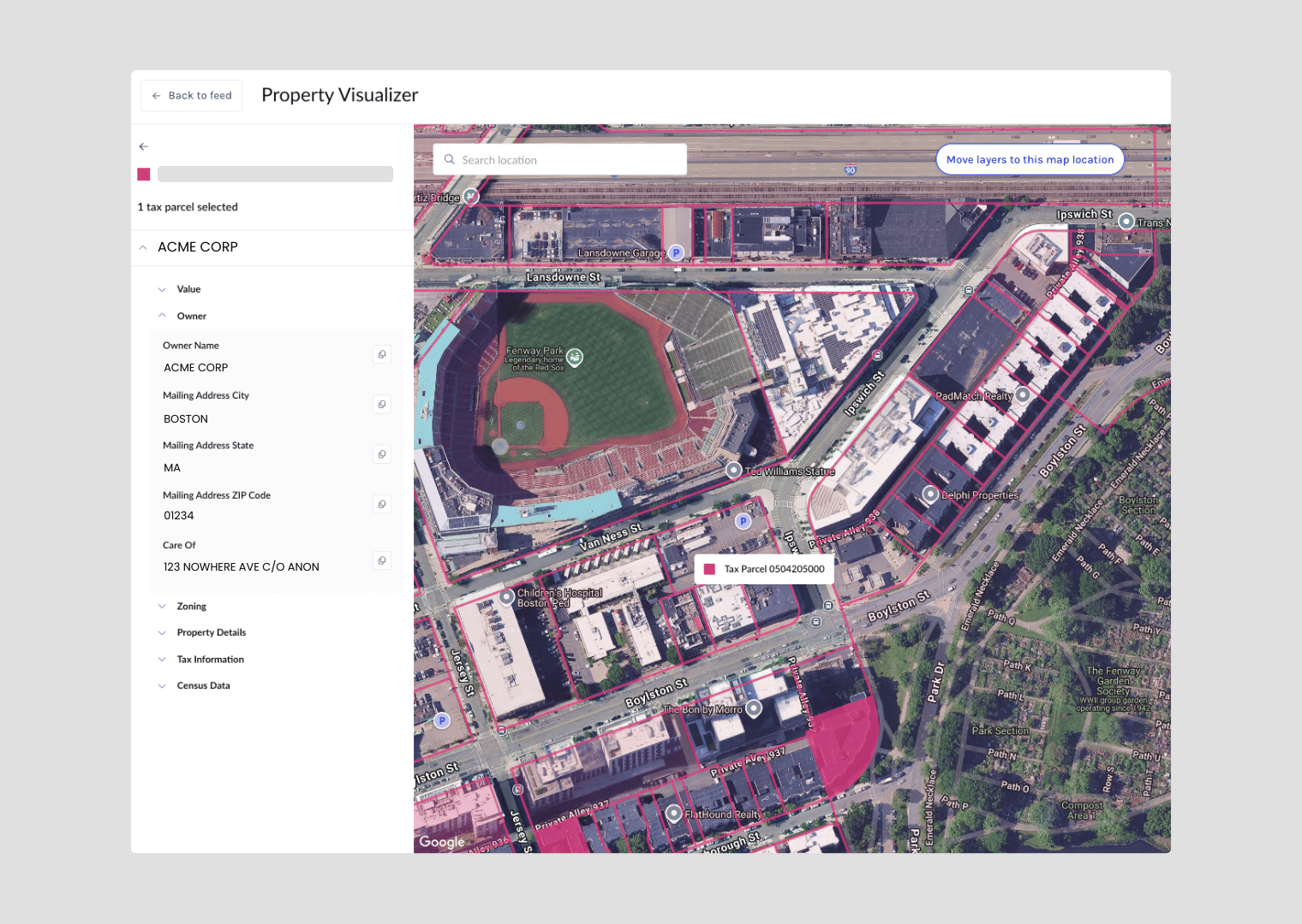 ✓ Quickly locate a site: Eliminate delays at the outset by searching by address or parcel number and confirming the correct parcel, boundaries, and ownership with tax data.
